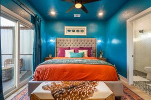 Peacock-blue velvet curtains framed the sliding-glass doors, while an antique desk, vintage wood chair, and a patterned rug grounded the room in texture. Above the bed, agate-slice artwork echoed the natural beauty of the Hill Country. The bed had to feel irresistible. I wanted guests to crave sinking into it at night and never want to get out in the morning.