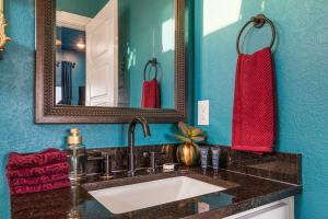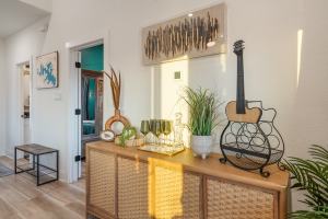 We reimagined the entry with a new rug, a guest book, art that nods to the region’s western spirit, and a map of Canyon Lake, creating a true sense of arrival. In the kitchen, a custom-designed coffee station complete with cactus-inspired mugs and a locally made sign bearing the home’s name elevated a simple daily ritual into a guest-friendly amenity. Even the bathrooms were rethought with jewel-toned linens, new mirrors, and fresh accents that turned utility into indulgence.